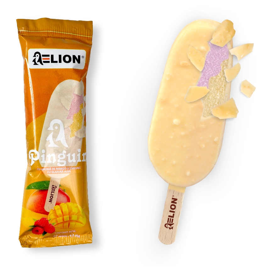 ÎNGHEȚATĂ PINGUIN CU AROMĂ DE MANGO ȘI ZMEURĂ ȘI GLAZURĂ DE CIOCOLATĂ ALBĂ